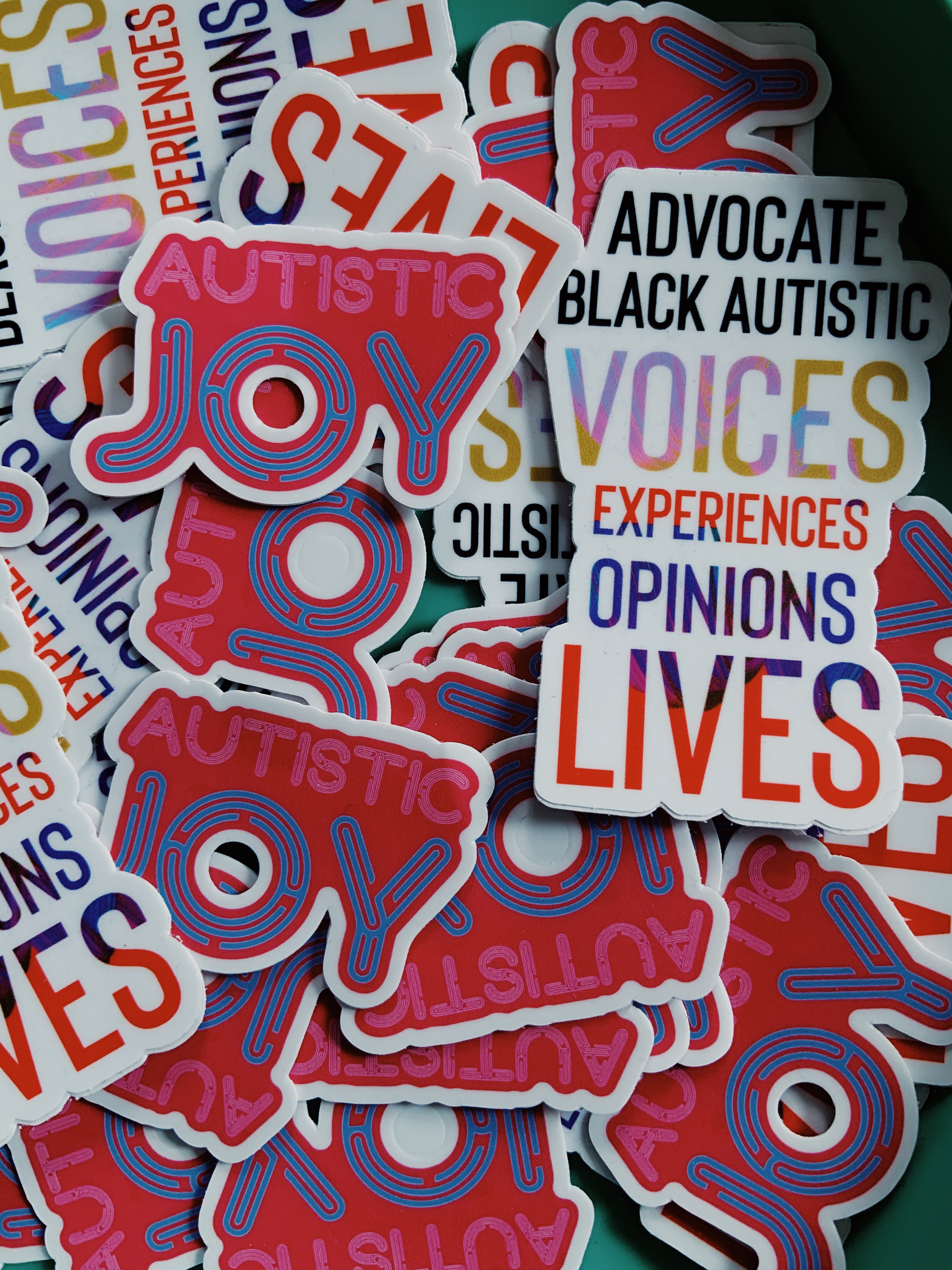 “Graphic designer Jen White-Johnson challenges the iconography typically associated with autism—such as the missing puzzle piece used by the organization Autism Speaks, which could be read as suggesting that something is “missing” from the minds of Autistic people—with alternative symbols that signify the value of Black disabled people like herself; White-Johnson is also the mother of an autistic child. Her Black Disabled Lives Matter logo superimposes an infinity sign on a Black Power fist, symbolizing possibility rather than brokenness. The symbol is a graphic manifestation of White-Johnson’s philosophy that “mothering as an act of Resistance means to redesign ableist visual culture.” Another of her graphics is a pink and silver “Autistic Joy” logo that she prints on shiny hologram stickers in a gesture toward greater visibility. Her work forms a visual language that diverges radically from standard icons such as the international symbol of access (the person-in-a-wheelchair icon used for accessible parking spots and bathrooms) or the puzzle piece. White-Johnson’s work instead roots itself in Black disability culture and activism, and carves space for celebrating and valuing Black disabled lives.”