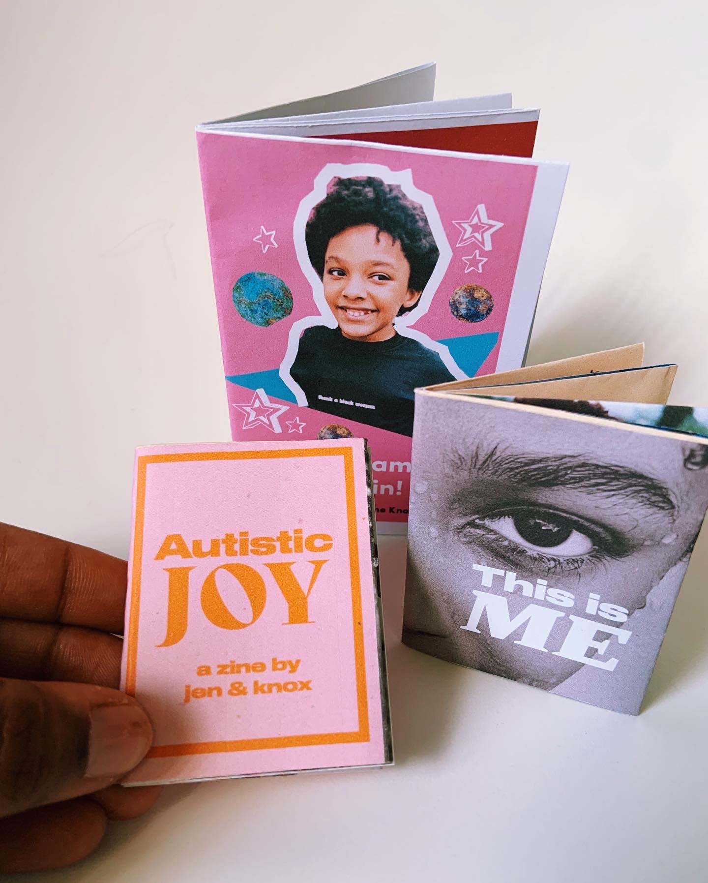 Jen White Johnson Kids Solidarity Zine Fest Zine Pack 2 Image 2: Photo of Black and Autistic Boy hold a mini zine titled "Autistic Joy" he's holding the zine closely to his eye and he is smiling.