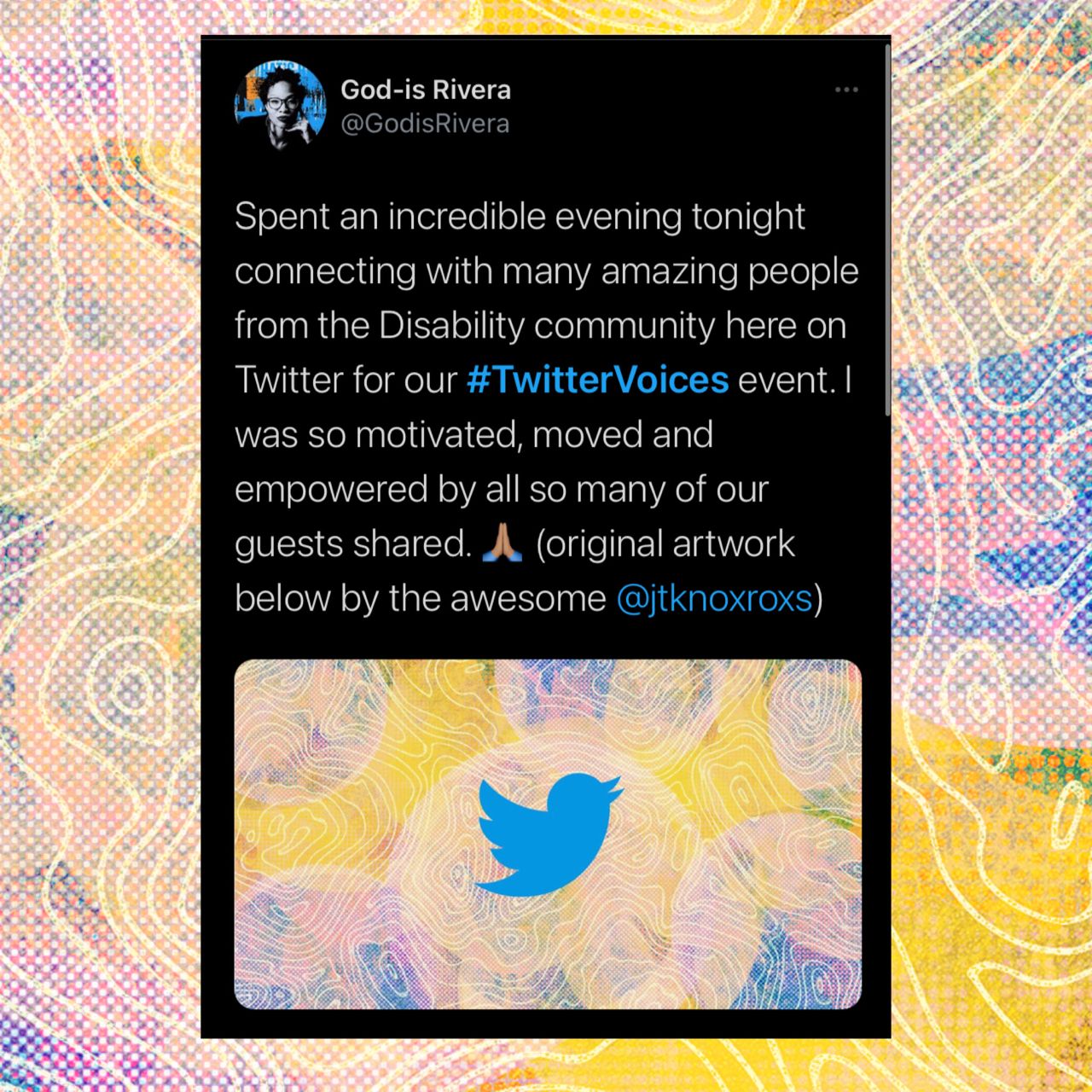 Thank you to #TwitterVoices for sending me this beautiful swag box! In March and October 2021 I was so honored when Twitter reached out to me asking for custom-designed artwork for the #TwitterVoices Disability community event! I was able to use my love for digital collage to create vibrant gritty textures for my disabled comrades for a virtual evening of dinner conversation and connection!