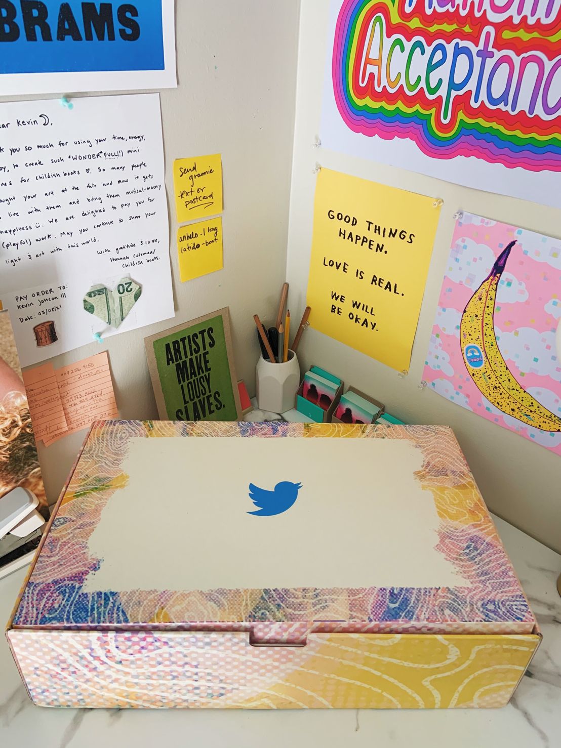 In addition to my textures being used for the digital invites and slides for the virtual event, each guest was sent an official #TwitterVoices swag box infused with my texture and twitter goodies that include our Twitter handles!